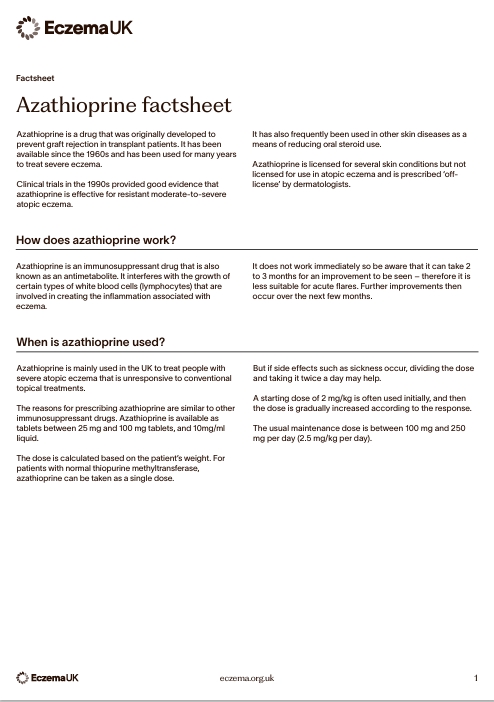 Azathioprine is a drug that was originally developed to prevent graft rejection in transplant patients. It has been available since the 1960s and has been used for many years to treat severe eczema. Clinical trials in the 1990s provided good evidence that azathioprine is effective for resistant moderate-to-severe disease. It has also frequently been used in other skin diseases as a means of reducing oral steroid use. However, azathioprine is not licensed for use in atopic eczema and is prescribed ‘off-license’ by dermatologists.