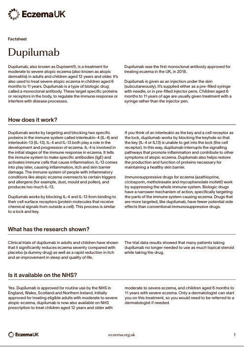 Dupilumab is a type of biologic drug called a monoclonal antibody. These target specific proteins or receptors in the body, to regulate the immune response or interfere with disease processes. Dupilumab was the first monoclonal antibody approved for treating eczema in the UK, in 2018.