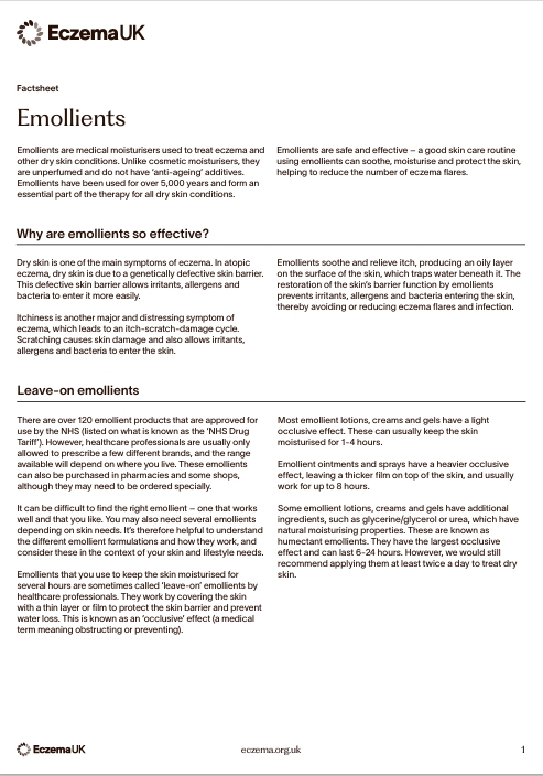 Emollients are medical moisturisers used to treat eczema and other dry skin conditions. Unlike cosmetic moisturisers, they are unperfumed and do not have ‘anti-ageing’ additives.