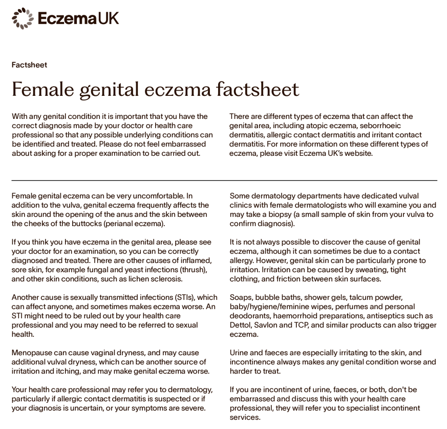 If you experience genital irritation, it is better to seek medical help than to self-medicate, since some over-the-counter treatments contain potentially allergenic and irritant ingredients. Your doctor will usually prescribe emollients and topical steroids (steroid creams and ointments) to treat genital and perianal eczema.