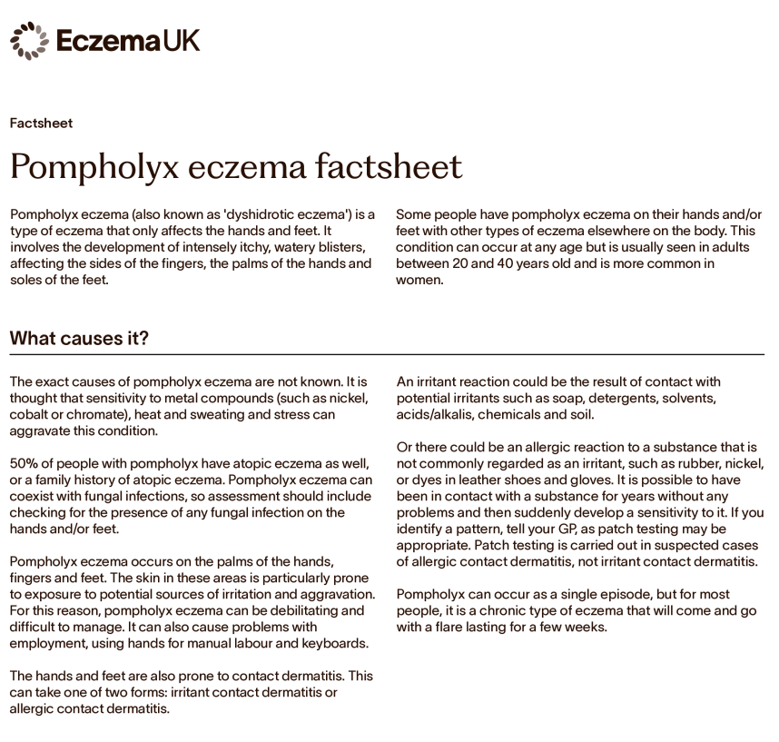 Pompholyx eczema (also known as ‘dyshidrotic eczema’) is a type of eczema that affects the hands and feet. This condition can occur at any age but is usually seen in adults under 40, and is more common in women. Fifty percent (50%) of people with pompholyx have atopic eczema as well, or a family history of atopic eczema.