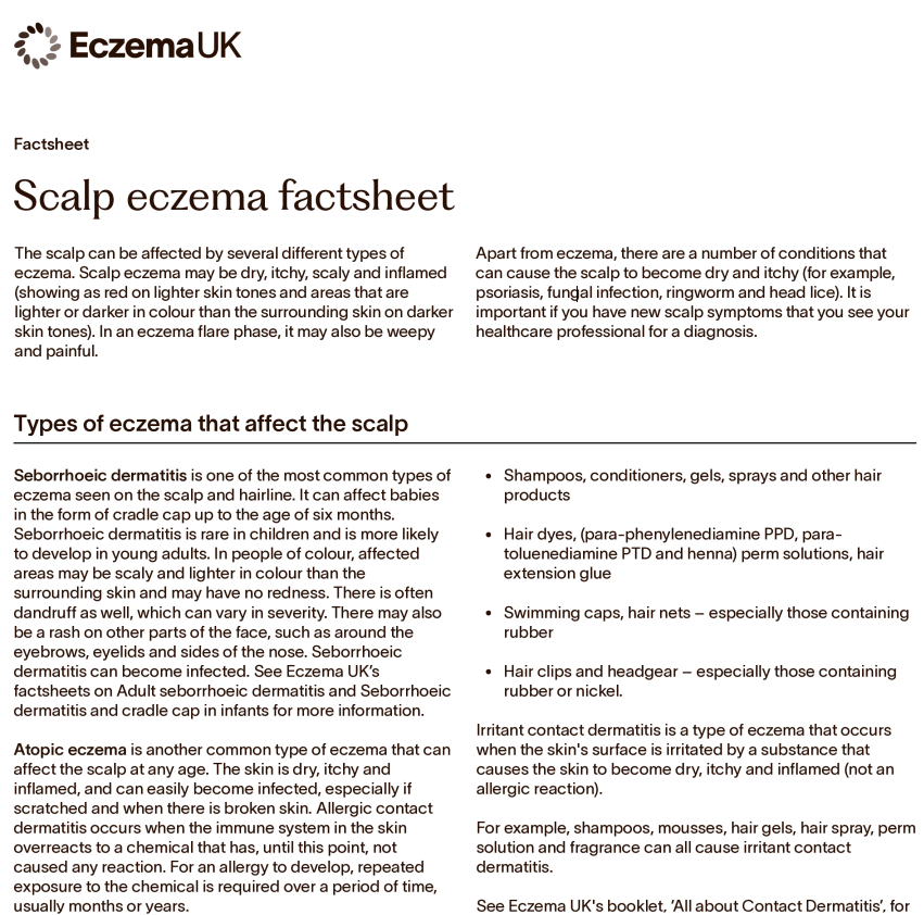 The scalp can be affected by several different types of eczema, including seborrhoeic dermatitis, atopic eczema, allergic contact dermatitis and irritant contact dermatitis.